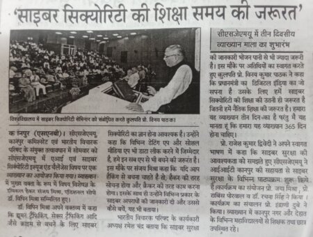 दिनांक 02.09.2024 (दिन सोमवार) को छत्रपति शाहू जी महाराज विश्वविद्यालय के संयुक्त व्याख्यान कक्ष के L-1 सभागार में विश्वविद्यालय, कमिश्नरेट कानपुर, डिफेन्स रिसर्च आर्गेनाइजेशन, राष्ट्रीय सेवा योजना, राष्ट्रीय कैडिट कोर, ग्रुप ऑफ डॉक्टर्स तथा भारतीय विचारक समिति के संयुक्त तत्वावधान में “आर्टिफिशल इंटेलीजेंस एवम् साइबर सिक्योरिटी: इश्यूज एंड चैलेंजैज” विषय पर एक तीन दिवसीय अवेयरनेस प्रोग्राम के आयोजन का शुभारम्भ किया गया। इस कार्यक्रम का शुभारम्भ विश्वविद्यालय के माननीय कुलपति प्रो. विनय कुमार पाठक, मुख्य अतिथि के रूप में उपस्थित एडिशनल कमिश्नर ऑफ पुलिस डॉ. विपिन कुमार मिश्रा, कुलसचिव डॉ. अनिल कुमार यादव, भारतीय विचारक समिति के संरक्षक श्री बलराम नरूला, कार्यकारिणी अध्यक्ष श्री रमेश चंद्रा, बिषय बिशेषज्ञ के रूप में उपस्थित रिवील अफ्फर्म टेस्टीफाई के सी ई ओ एवं डायरेक्टर श्री संजय मिश्रा जी, IIT कानपुर से आये अतिथि प्रो. अर्नब भट्टाचार्य, कॉलेज डेवलपमेंट काउंसिल के निदेशक प्रो. राजेश कुमार द्विवेदी एवं अन्य सदस्यों जैसे श्री उमेश दीक्षित इत्यादि ने द्वीप प्रज्वलित करके किया। ब्लाइंड स्कूल नेहरू नगर, कानपुर से आये हुए दिव्यांग छात्र एवं उनकी मेंटर डॉ. प्रतिभा गुप्ता द्वारा सरस्वती वंदना एवं स्वागत गीत प्रस्तुत किया गया। सभी आये हुए अतिथियों का स्वागत भारतीय विचारक समिति के सदस्यों द्वारा स्वागत पट्टीका पहना कर, पौधे एवं स्मृति चिन्ह देकर किया गया। अतिथियों का स्वागत करते हुए माननीय कुलपति प्रोफेसर विनय कुमार पाठक जी ने कहा कि “प्रधानमंत्री का डिजिटल इंडिया का जो सपना है उसके लिए हमें साइबर सिक्योरिटी की शिक्षा की उतनी ही जरूरत है जितनी हमें नैतिक शिक्षा की जरूरत है। हमारा यह अवेयरनेस कार्यक्रम तीन दिन का जरूर है, परंतु मैं यह मानता हूं कि इस तरह के कार्यक्रम 365 दिन होने चाहिए।” प्रथम दिवस में मुख्य अतिथि एवं मुख्य वक्ता के रूप में उपस्थित एडिशनल कमिश्नर ऑफ पुलिस डॉ. विपिन कुमार मिश्रा जी ने बताया कि “ह्यूमन ट्रैफिकिंग, child exploitation, sex ट्रैफिकिंग जैसे क्राइम से बचने के लिए साइबर सिक्योरिटी का ज्ञान होना आवश्यक है। विभिन्न डेटिंग एप और सोशल मीडिया एप भी डाटा लीक करने में जिम्मेदार हैं, हमें इन सभी एप्स से भी बचने की ज़रूरत है।” कॉलेज डेवलपमेंट काउंसिल के निदेशक प्रो. राजेश कुमार द्विवेदी ने अपने स्वागत भाषण में सभी को अवगत कराया कि आज के इस दौर में साइबर सुरक्षा की आवश्यकता को समझते हुए सीएसजेएम विश्वविद्यालय ने आईआईटी कानपुर की सहायता से, विश्वविद्यालय एवं सम्बद्द महाविद्यालयों के स्नातक के प्रथम एवं तृतीय सेमेस्टर के छात्रों के लिये साइबर सुरक्षा में वोकेशनल पाठ