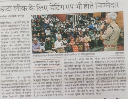 कानपुर के कमिश्नर ऑफ पुलिस श्री अखिल कुमार जी सभी को सम्बोधित करते हुए कहा कि “साइबर सुरक्षा आज के डिजिटल युग में अत्यंत महत्वपूर्ण है। भविष्य में साइबर स्पेस की बढ़ती भूमिका के मद्देनजर, हमें साइबर अपराधों से बचाव के लिए सामूहिक प्रयास और सतर्कता बढ़ानी होगी। उन्होंने सभी को अवगत कराया हमें अनावश्यक ऐप डाउनलोड करने से बचना चाहिए, उन्होंने सभी उपस्थित विद्यार्थियों को यह भी बताया कि किस प्रकार हैकर्स आपसे आपकी व्यक्तिगत जानकारी को हैक करके आपसे जुड़े लोगों को भावुक संदेश भेज कर पैसे मांगते है। उन्होंने यह भी बताया कि आर्टिफिशल इंटेलीजेंस साइबर सुरक्षा को बढ़ाने की महत्वपूर्ण संभावनाएं तो प्रदान करता ही है, लेकिन इसका दुरुपयोग अधिक जटिल और नुकसानकारी हमलों की संभावनाओं को बढ़ा सकता है।”